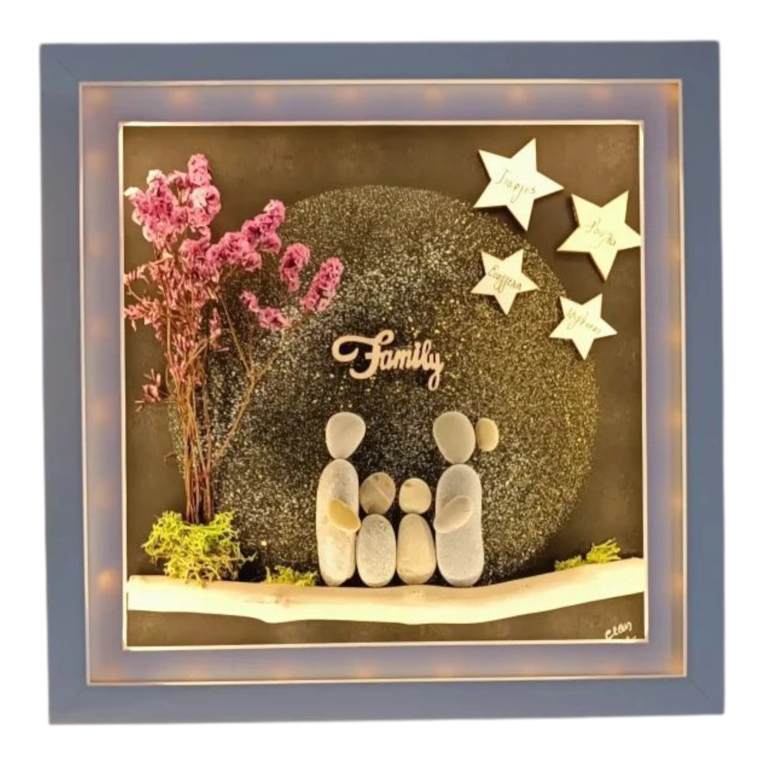 Μοναδικό προσωποποιημένο κάδρο φτιαγμένο από βότσαλα και υλικά της φύσης .Ιδανική πρόταση για δώρο ή και για την διακόσμηση του δικού σας χώρου. Στα αστέρια αναγράφουμε τα ονόματα της οικογένειας εφόσον επιθυμείτε.